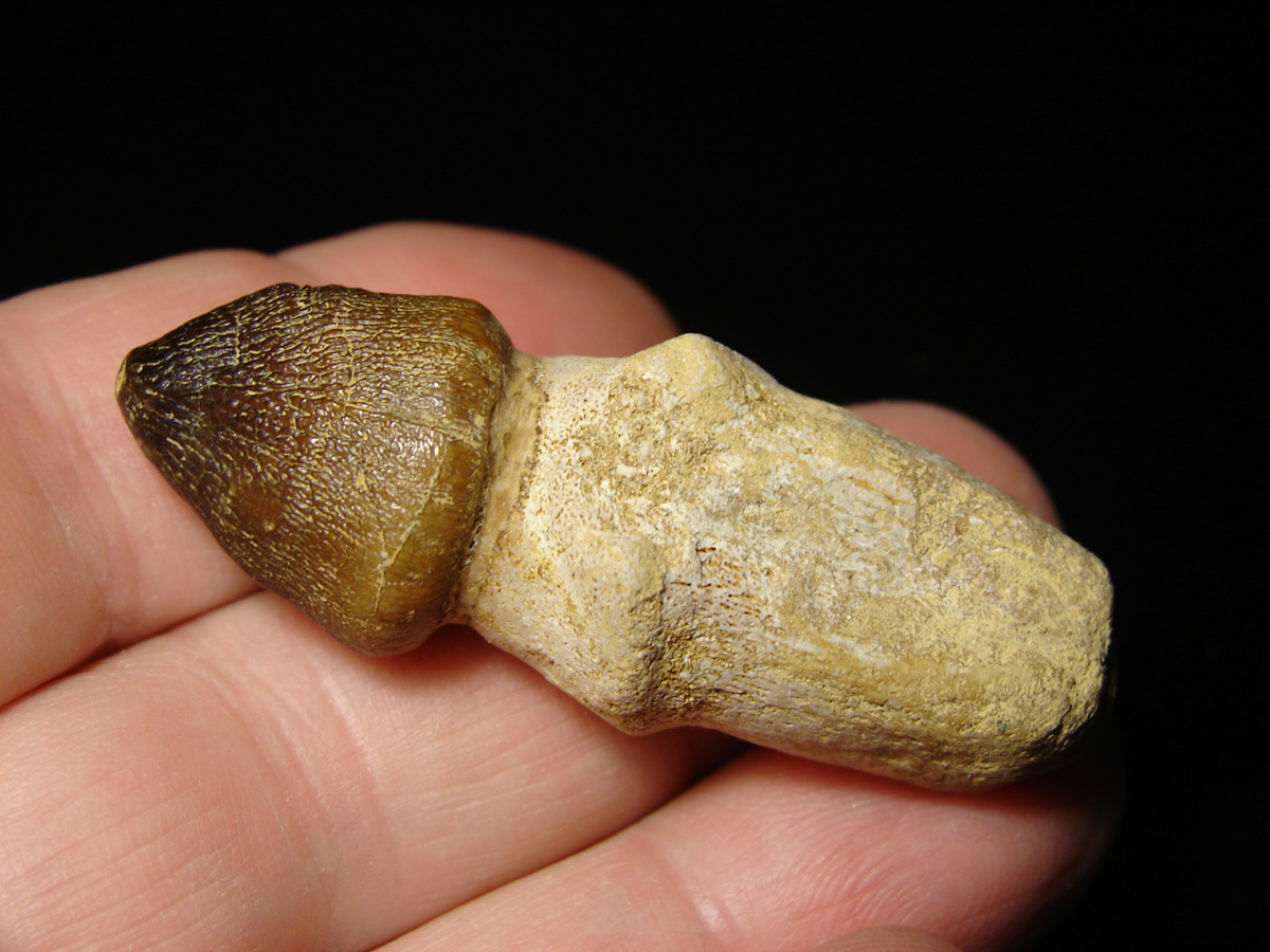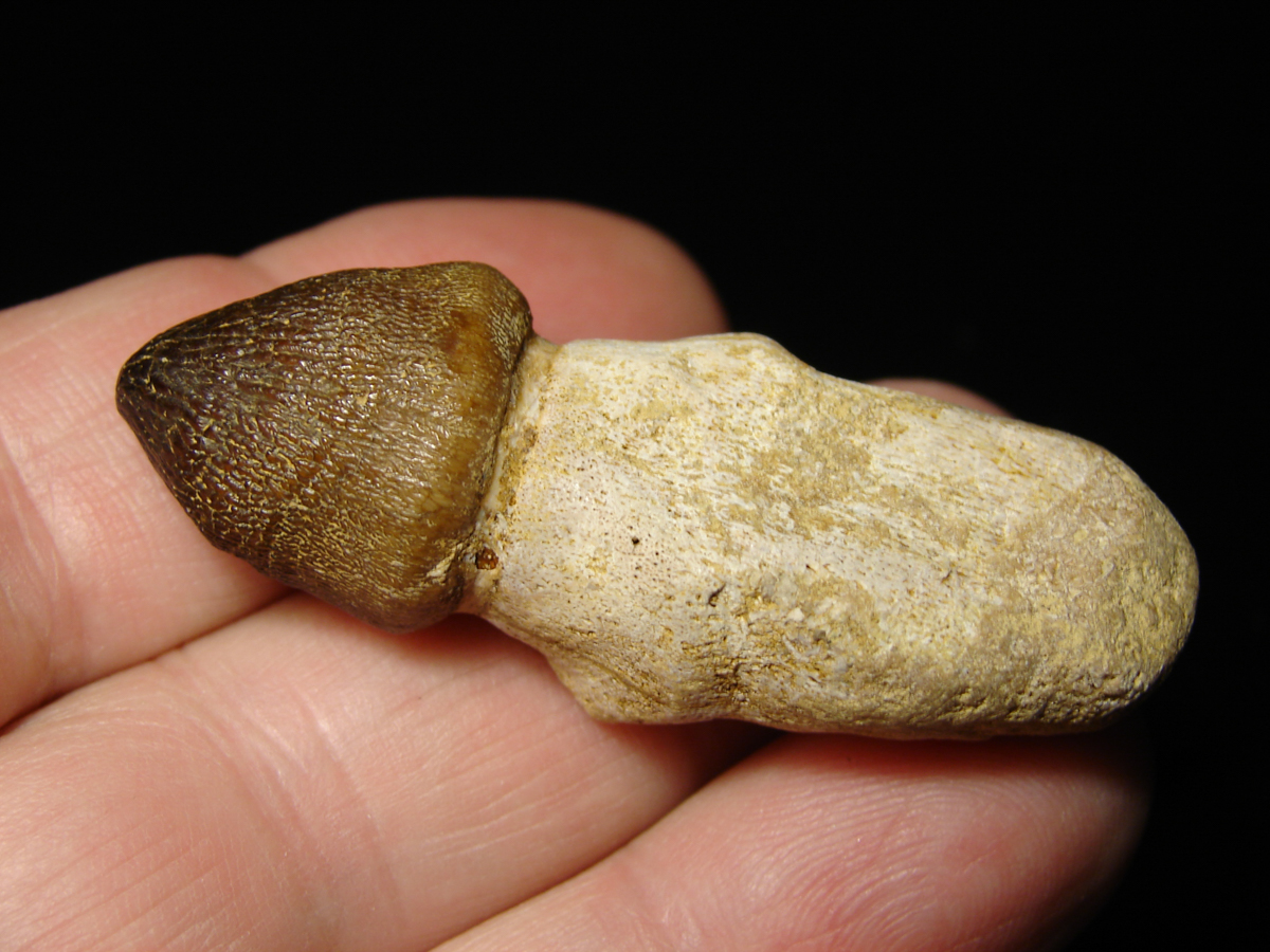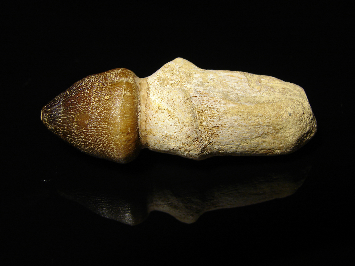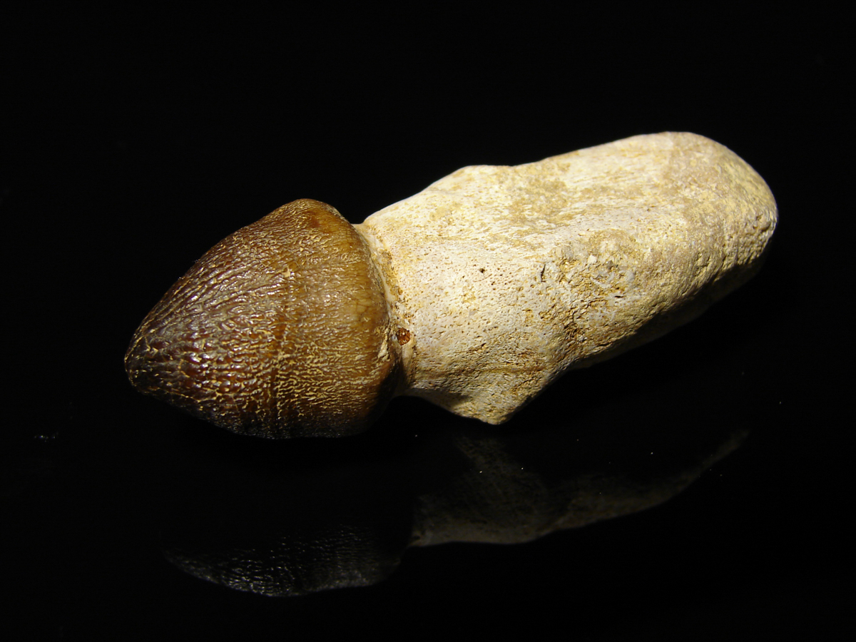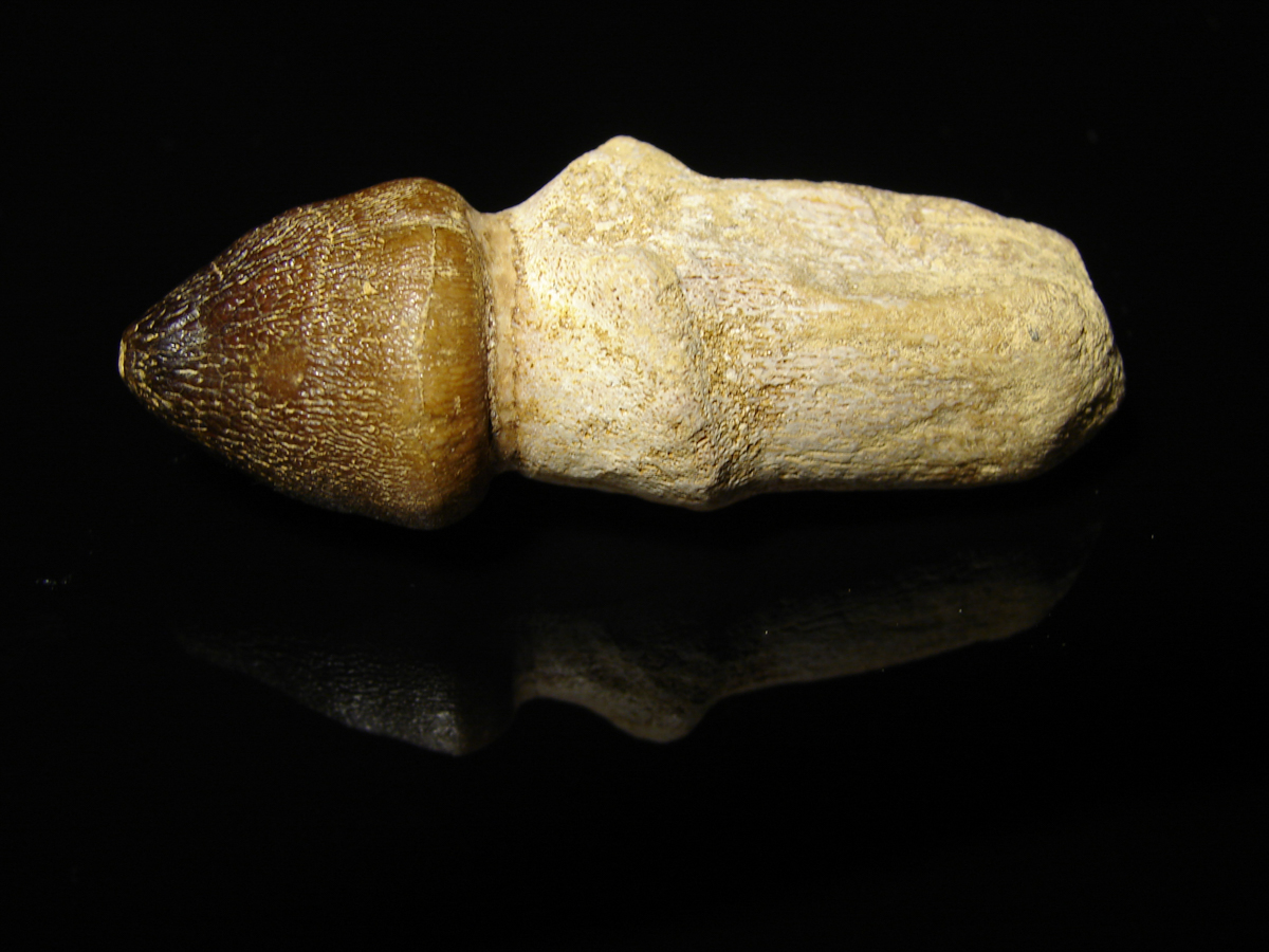Kompletní krásný, neslepovaný zub mosasaura r. Globidens. Zub má kompletní sklovinu i kořen. Musím upozornit, že takto zachovalé zuby nejsou moc běžné. Někomu tvar tohoto zubu připomíná malou houbičku, někomu něco jiného 🙂