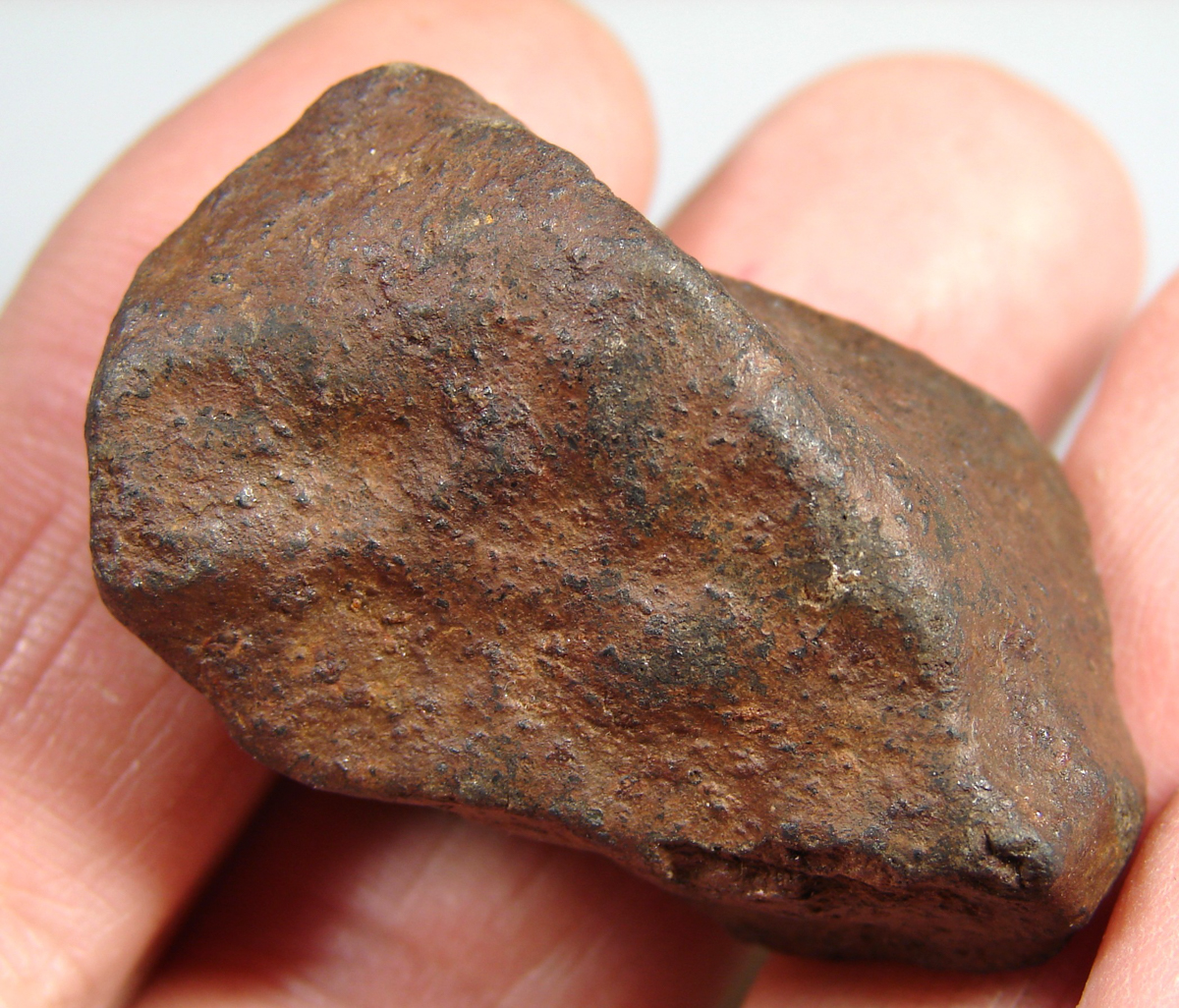 Velmi krásný kamenný meteorit – chondrit. Na povrchu meteoritu jsou dokonale zachovalé regmaglypty – útvary vzniklé na povrchu hořením meteoritu při průchodu atmosférou Země. Meteorit má tmavou barvu, světlejší skvrnky zrzavé barvy ukazují k přítomnosti železa. Meteorit může mít na povrchu drobné prasklinky. Podle hmotnosti usuzuji, že se jedná o typ L, tedy chondrit s nízkým obsahem železa. Krásný učebnicový celotvar!