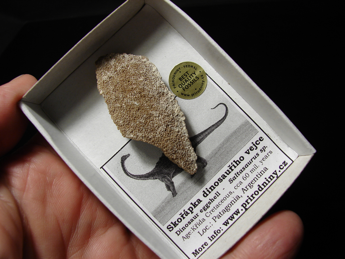 Krásně zachovalá, prohnutá skořápka vejce dinosaura r. Saltasaurus, s výraznou granulací na povrchu.  Zkameněliny těchto vajec se našly na několika lokalitách v Argentině (provincie Rio Negro) a ve státě Uruguay. Saltasauři patři mezi titanosauridní sauropody. Dříve, řádově asi tak před dvaceti roky, bylo možné na mezinárodních výstavách vidět i celá vejce, která jsou kulovitého tvaru a měřila i přes 20 cm v průměru. Dnes je vývoz z Argentiny zakázaný, ale kdo má staré zásoby, může je legálně nabídnout.